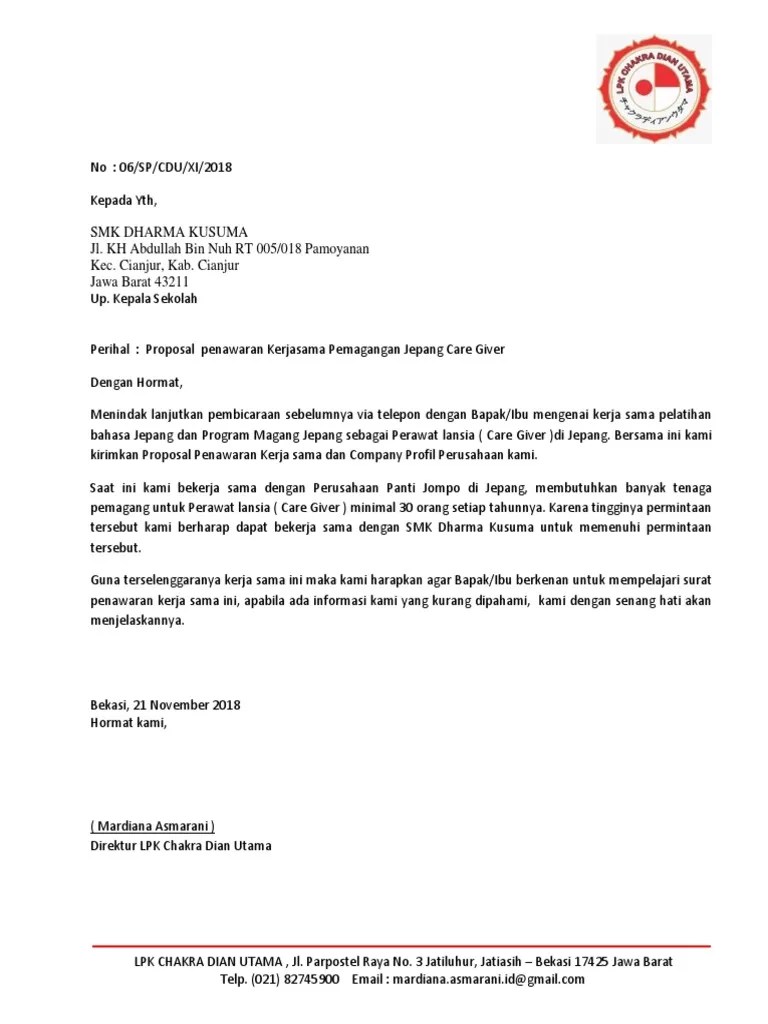 Permohonan itu bisa berupa dana izin kerjasama rekomendasi pemaafan dan lain lain. Demikian, semoga proposal ini dapat digunakan sebagai dasar untuk terjalinnya kerja sama antara teknik bisnis sepeda motor (tbsm) smk negeri cikalong dengan sumber berlian motor tasikmalaya. Kepala manager pt dioskuri shoes. Cara pengiriman barang juga dapat menjadi pertimbangan bagi klien saat akan melakukan kerjasama dengan perusahaan anda. Surat menyurat memang sudah nir asing lagi jika berada didalam sebuah perusahaan apalagi yang berada di posisi sekretaris atau admin yang mana niscaya akan ada banyak sekali kerjasama yg akan terjalin antar perusahaan juga industri hal ini tidak akan pernah luput dengan surat penawaran. Download contoh surat kerjasama bagi hasil doc. Dalam dunia bisnis, penawaran akan selalu ada antara pihak satu dengan pihak lainnya. perusahaan partner bersedia untuk menjalin kerjasama perusahaan partner mengundang divisi Contoh surat penawaran untuk desaign interior exterior dan daftar harga no. Ketika menawarkan kerjasama usaha, maka poin poin yang disampaikan harus komprehensif sehingga calon rekanan / investor yakin dengan tawaran kerjasama usaha anda. Mungkin sedikit berbeda dengan surat lainnya dalam surat penawaran kerjasama terdapat up alamat perusahaan tujuan pengiriman surat jenis barang jasa harga dan lampiran. proposal penawaran kerjasama pendahuluan kami adalah perusahaan yang bergerak di bidang jasa rental lcd projector yang telah berkiprah sejak tahun 2005 dan telah banyak menjalin kerjasama dengan perusahaan lain seperti. Kondisi tersebut jika tidak diatasi, akan membuat penurunan kinerja perusahaan atau bahkan kehilangan klien / customer.